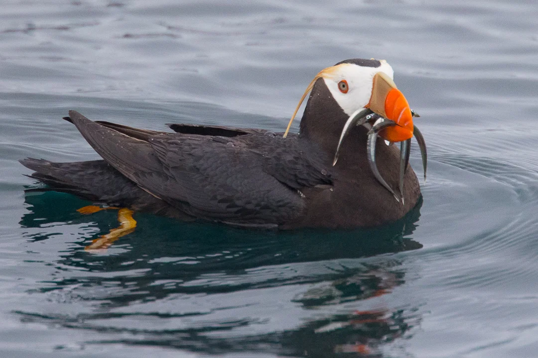 Tufted Puffin carrying sand lance in Alaska.