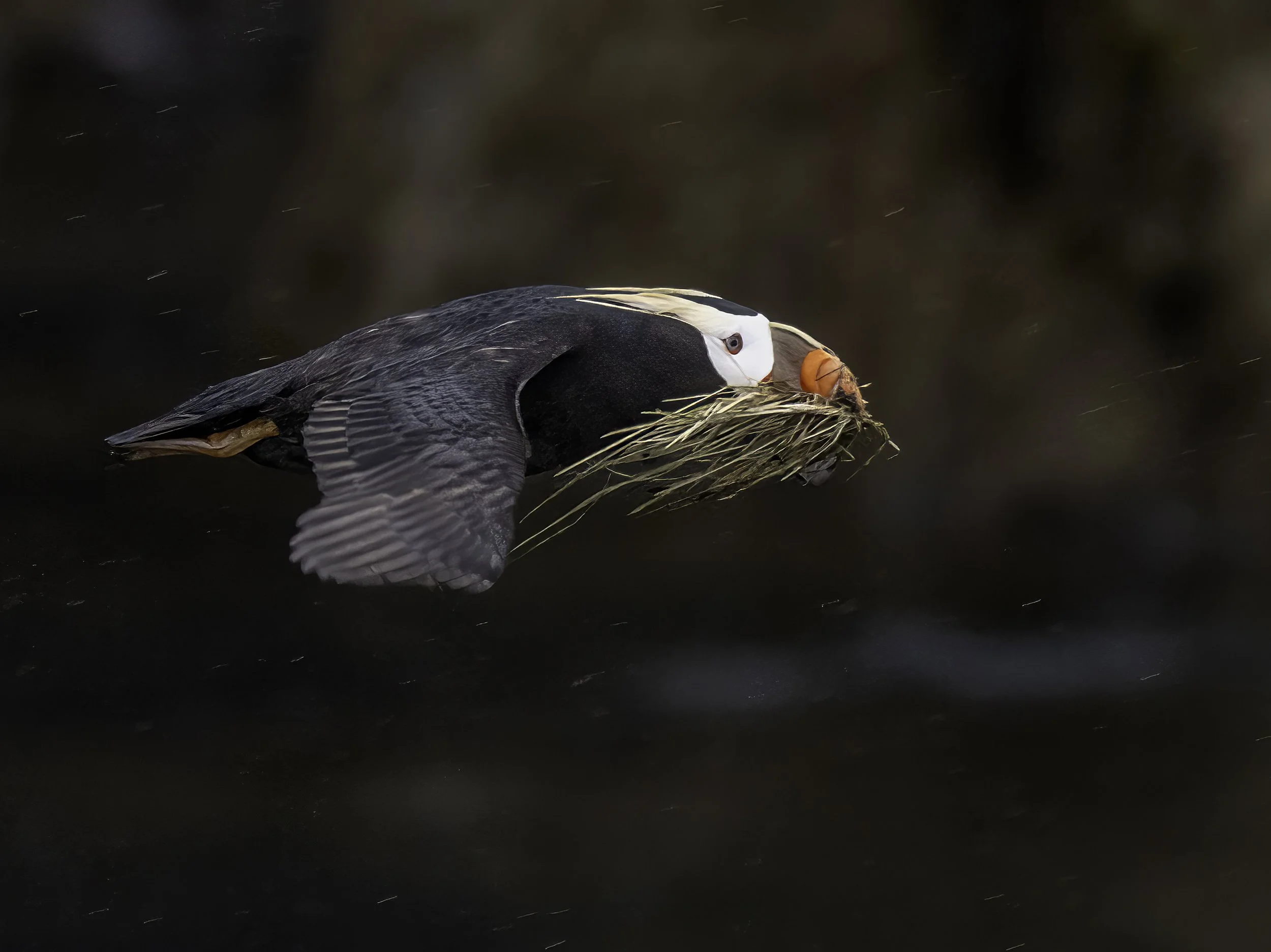 Tufted Puffin carrying nesting material in Alaska. Photo credit: Jenny Bowlden.